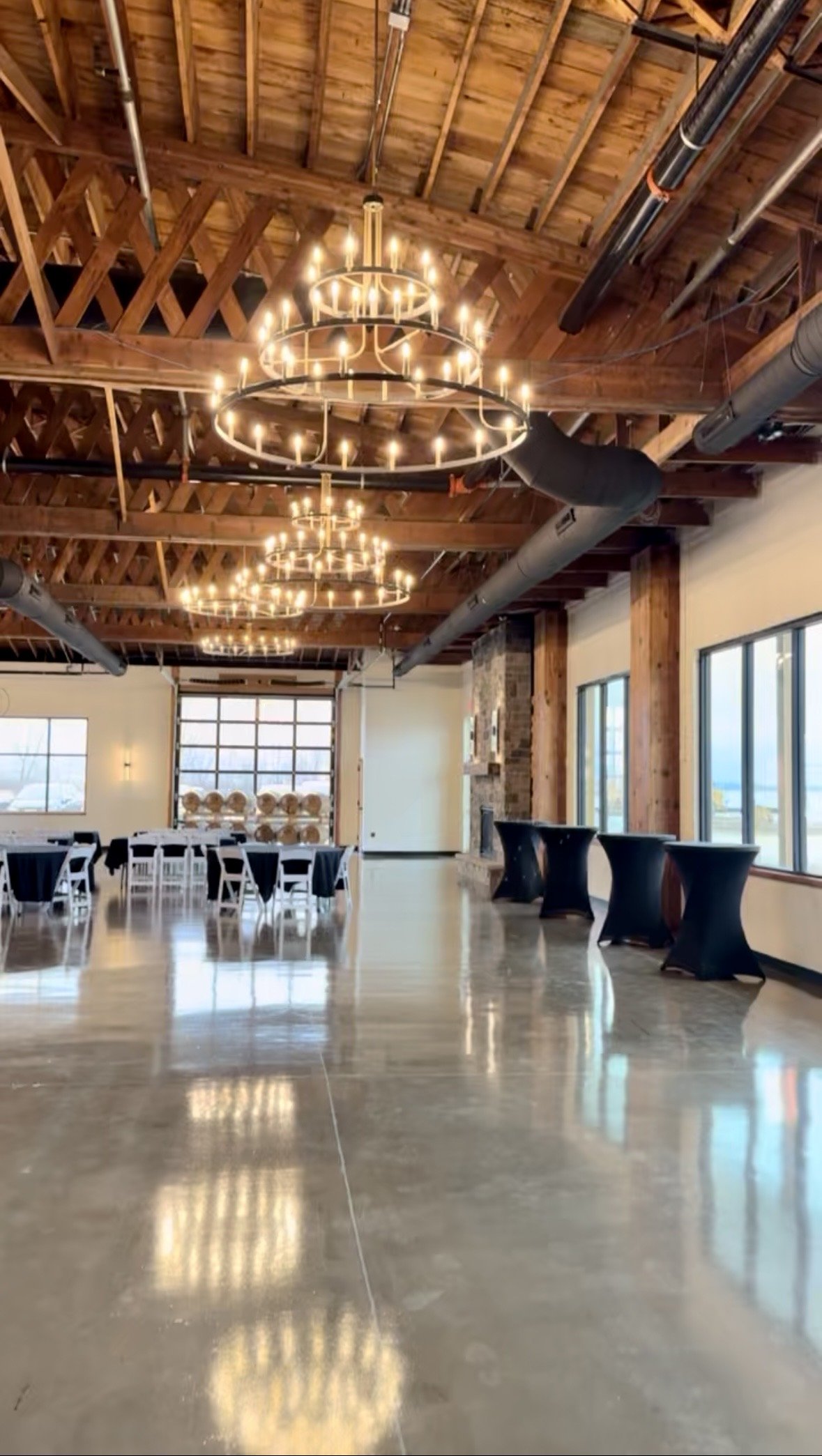 Rustic charm meets modern elegance at Olde 41. The venue features a beautiful outdoor ceremony space surrounded by nature, while the indoor reception area boasts exposed wood beams, warm lighting, and a spacious dance floor for celebrating all night long. Located on the second floor of the Vandervest Harley-Davidson Dealership, this beautifully rustic space features wood-beamed ceilings, a cozy double-sided stone fireplace, and an outdoor patio overlooking the ceremony site and Duck Creek.