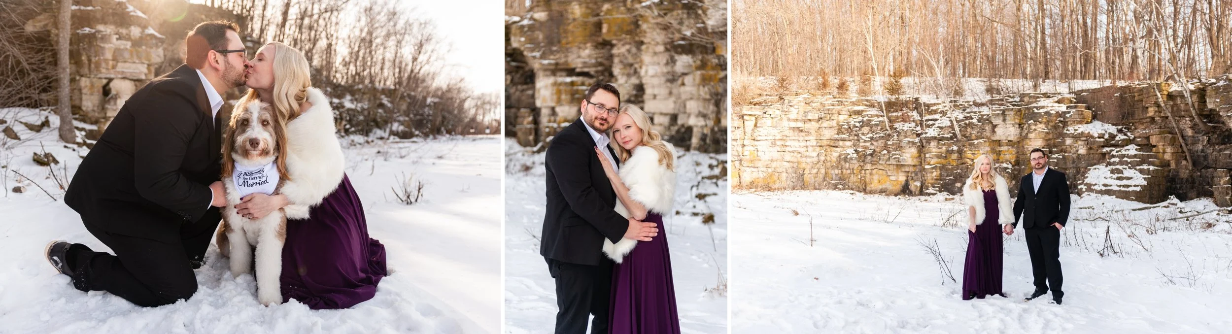 We decided to begin the session at High Cliff State Park, which was conveniently located near the Appleton area. The picturesque cliffs at the park were the perfect backdrop for their photos, and with the fresh snowfall from a few days prior, the scenery was nothing short of breathtaking. Lauren and Evan started off the shoot in more formal outfits, which is a classic choice that most of our couples go for. Lauren wore a flowy purple dress with a white fur shawl, while Evan looked sharp in a black suit and white shirt. Their adorable pup Aurora also came along for the adventure, and we spent some time capturing some playful moments with her in the snow.