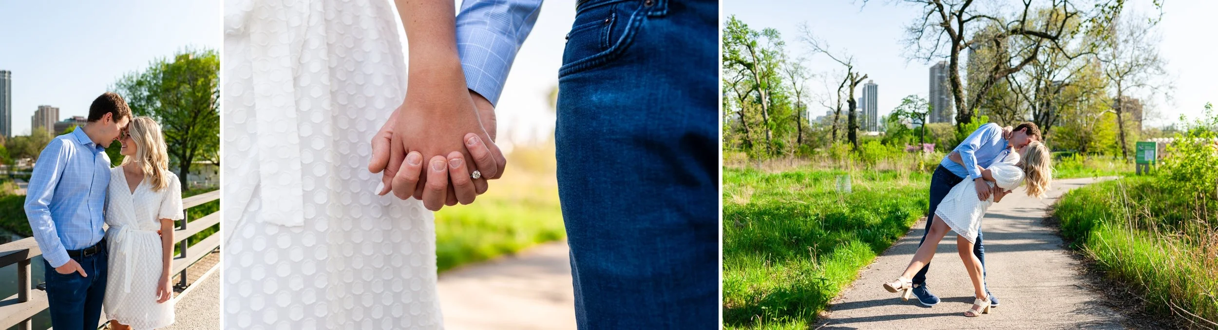As we explored Lincoln Park, Olivia and Kevin's favorite spots became apparent. They led us to a beautiful bridge over the east part of the park. It was an incredibly picturesque location with the Chicago skyline in the background, which held great meaning for both of them. Olivia, originally from Green Bay, found her second home in Chicago, and Kevin is a proud Chicago native. They met through a mutual friend who recognized their special connection, and ever since, their love story has been in the making.